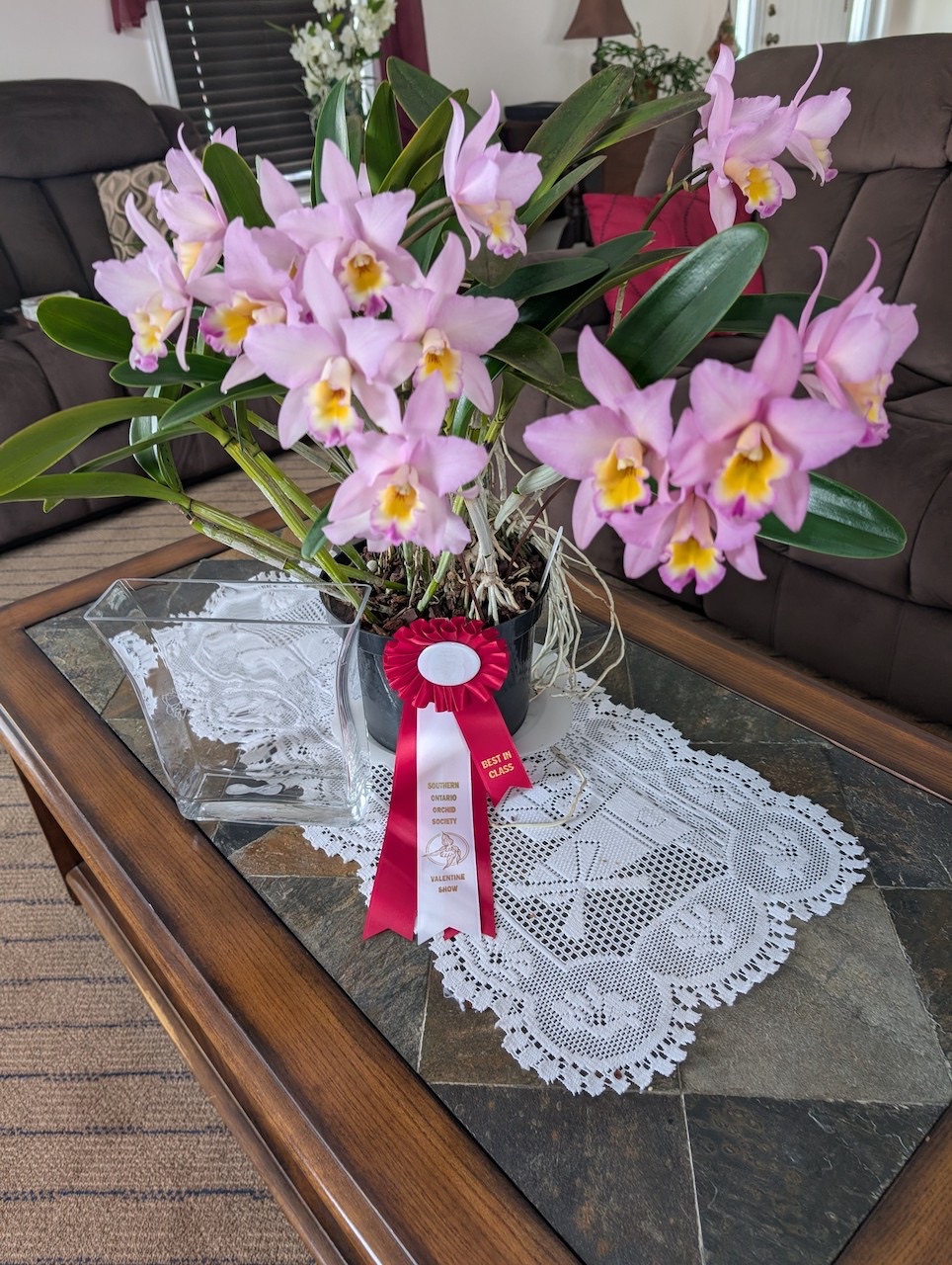 Four of the RBG orchids received ribbons as did 20 of the plants belonging to members. Congratulations to all the ribbon winners and a special congratulations to Ben Boers whose Cattleya maxima var coerulea received the award for Best Cattleya in the Show. A photo of his Cattleya can be found below.